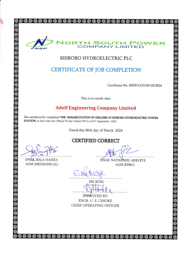 Job Completion Certificate For The Rehabilitation Of Chillers